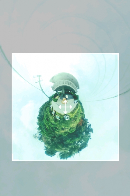 VR カメラで撮影した写真は通常、下の写真のように 360 度状態にスティッチされ、グリグリ動かすことろ空間画像を楽しむのが一般的。これはこれで面白いですが、SNS 映えするかというと、必ずしもそういったわけでもないですよね。見た目のインパクトは低めです。