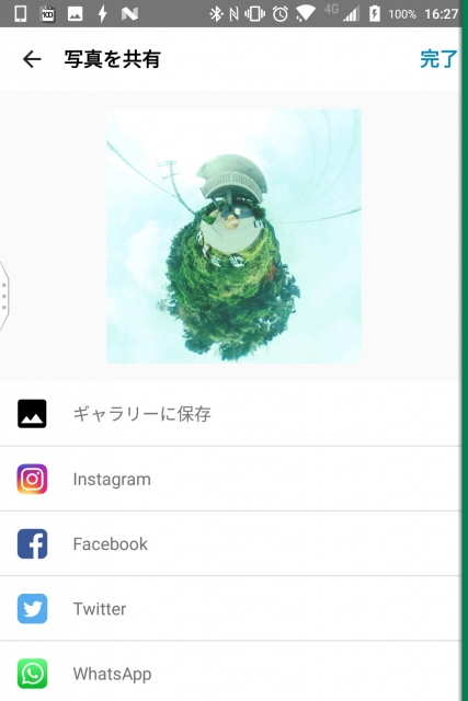 そして再度 “次へ”。あとは編集した “リトルプラネット” 形式の写真をスマートフォン本体に保存するか、SNS などで共有するかを自由に選択します。