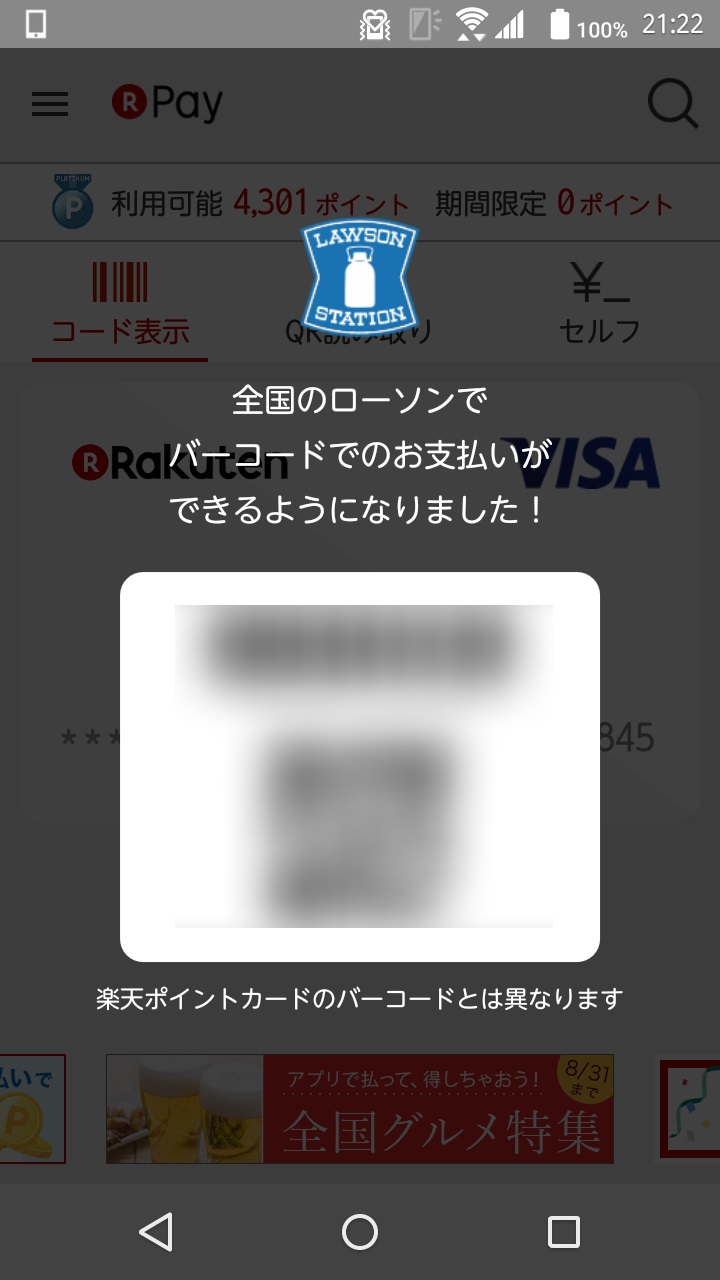 ローソンにおける「楽天ペイ」での実際の決済は、スマートフォンの画面に表示した QR コードを読み取ってもらう方式となります。