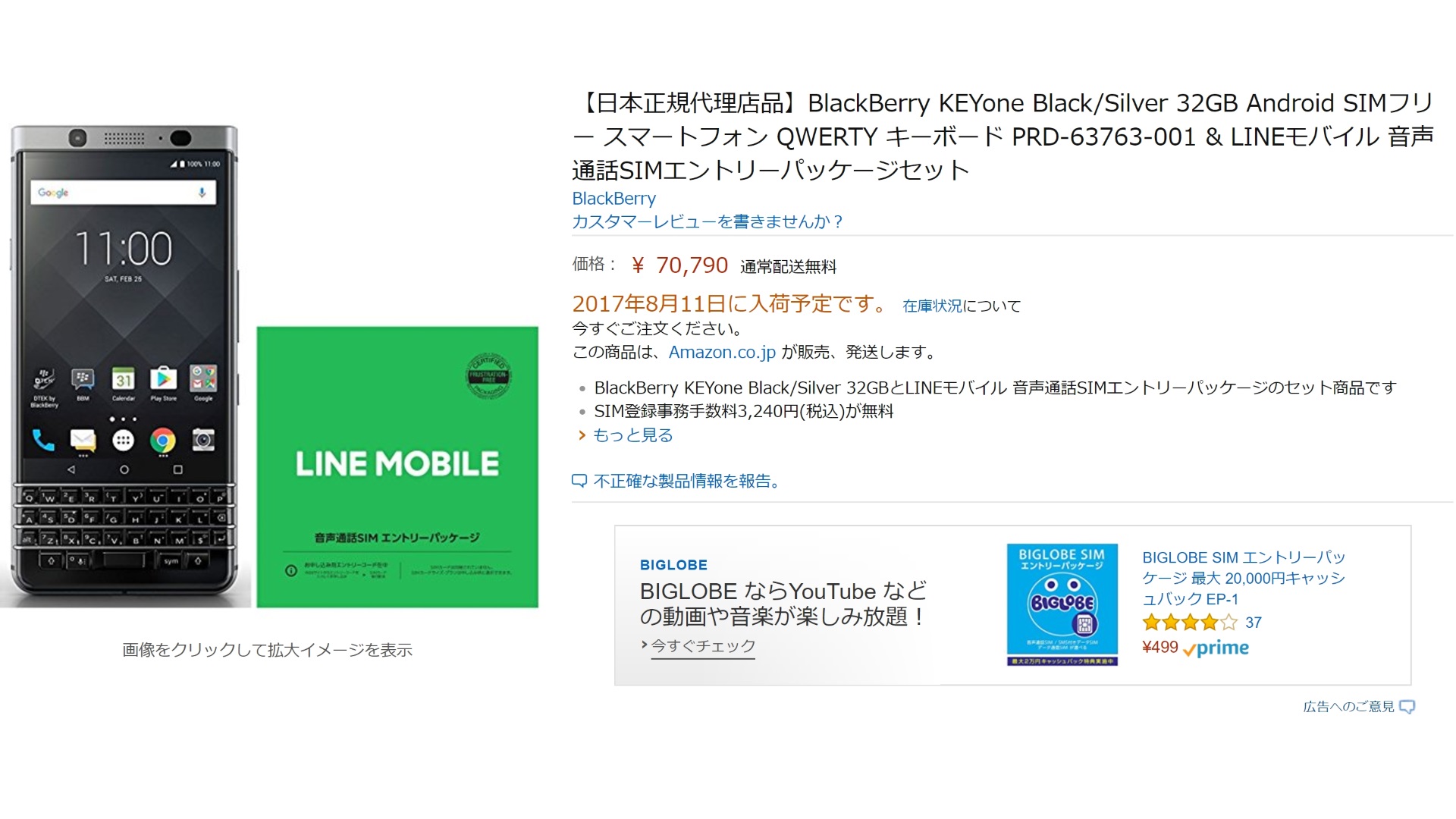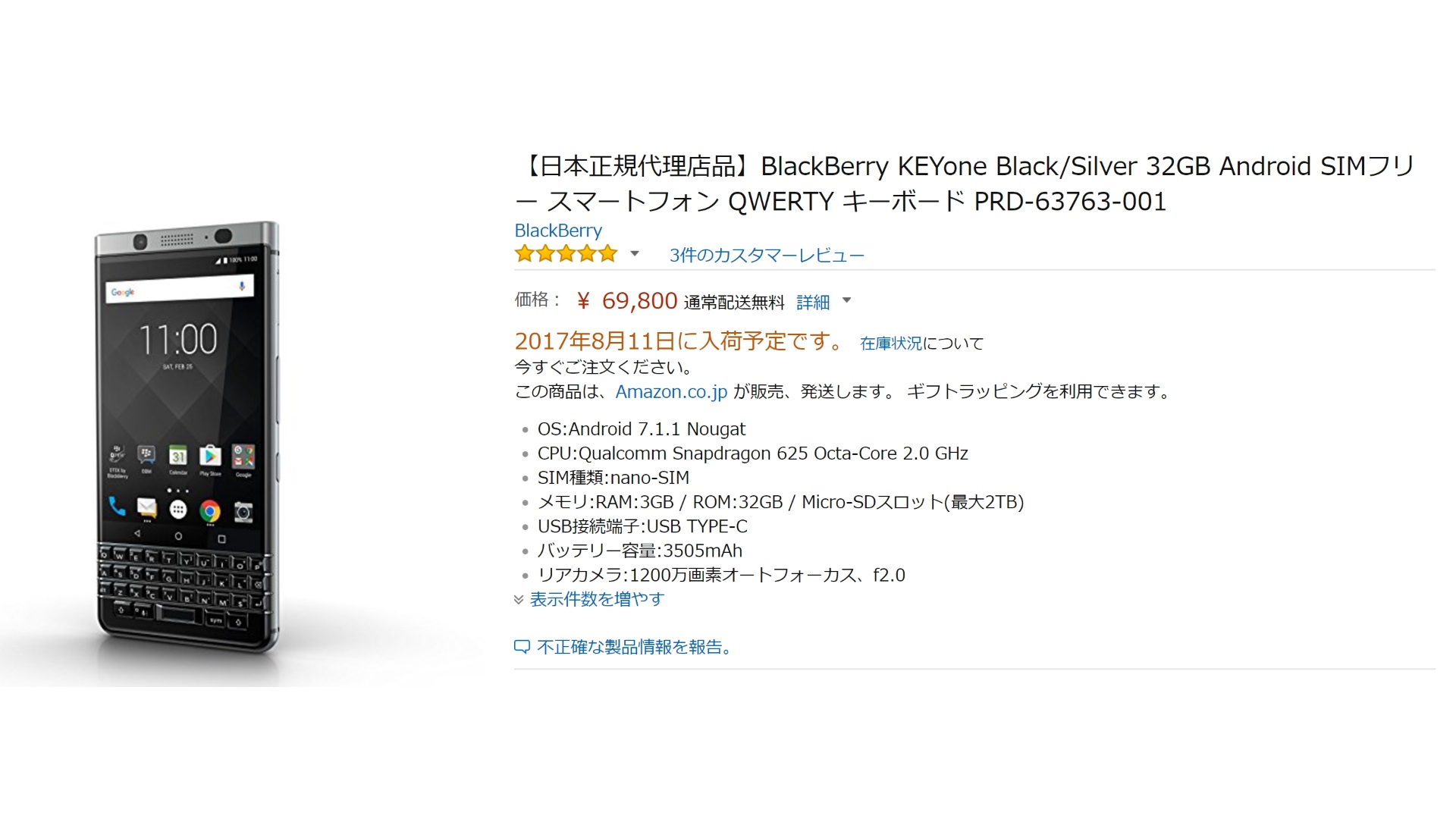 「KEYone(BBB100-6)」は Amazon において先日一時的に在庫が復活し販売が再開されましたが、入荷数も少なく、すぐに完売となってしまっていました。今回は改めて予約が可能となったということで、入荷数にそれなりの余裕があることが伺えます。
