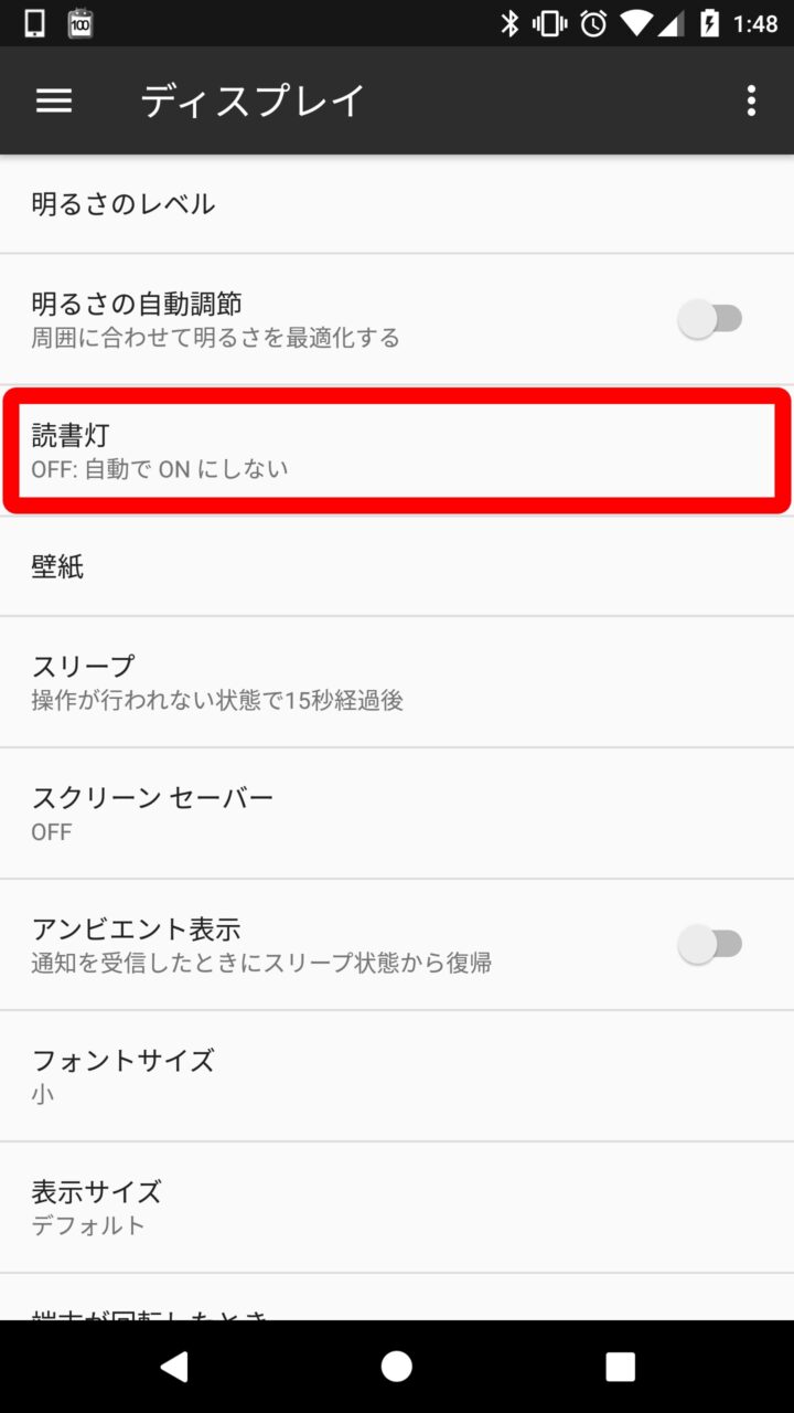 「読書灯」の設定は Android の設定を開き、“ディスプレイ” をタッチすると設定メニューとして出てきます。