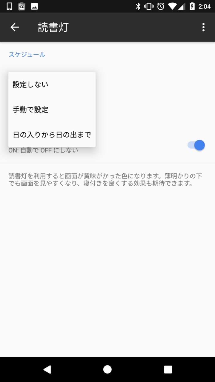 “日の入りから日の出まで” はその時期の日の入りと日の出が適用されて自動的に「読書灯」の オン / オフ が行われます。このほか、クイック設定にも「読書灯」のスイッチが用意されているので、クイック設定にスイッチを配置して オン / オフ を行うことも可能です。