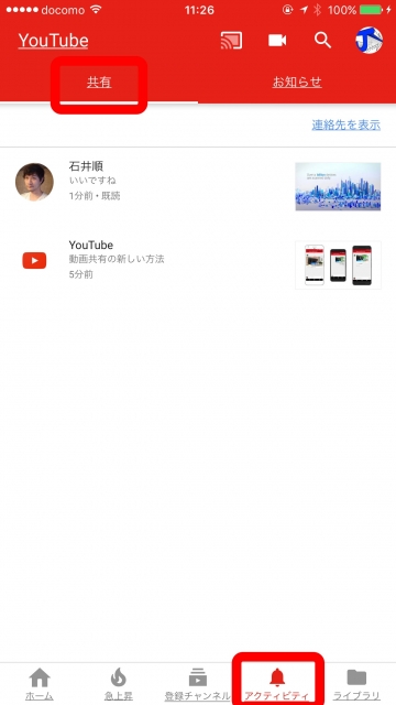 iOS の場合は画面下の “アクティビティ” タブをタッチして、表示される “共有” タブからアクセスすることができます。