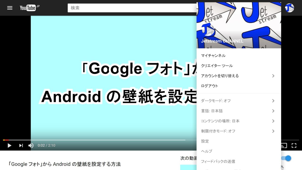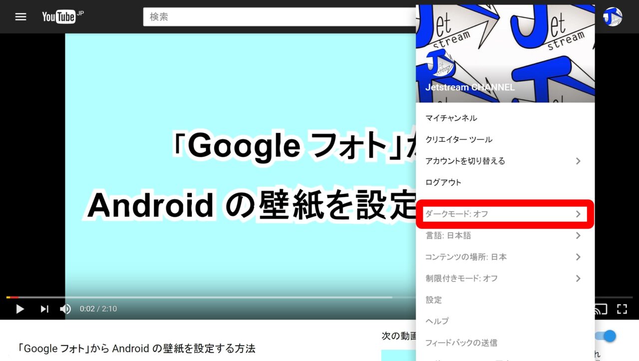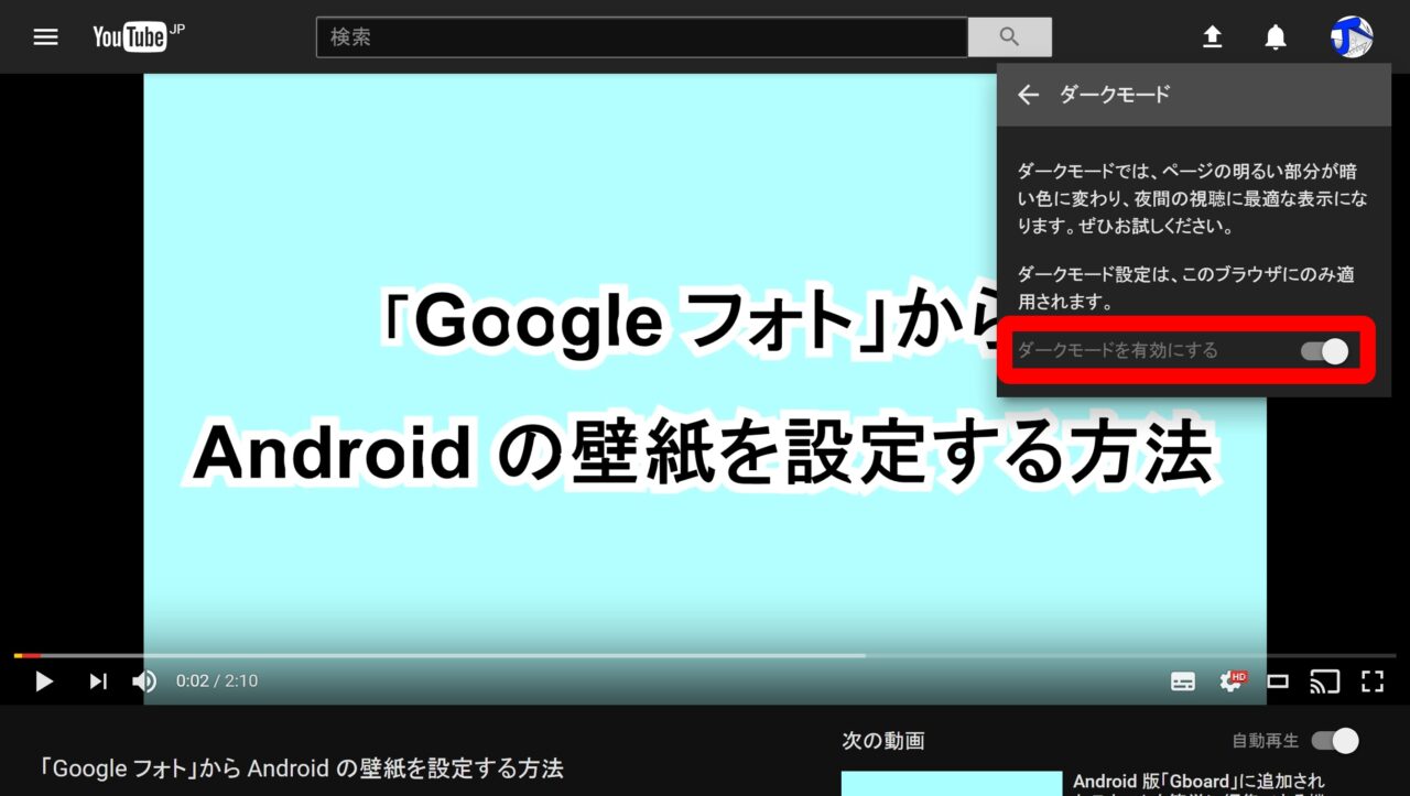 このほかデスクトップ版「YouTube」の新しいデザインはブラックベースの “ダークモード” も用意されています。“ダークモード” はまずデスクトップ版「YouTube」を新しいデザインに変更し、アカウントアイコンをクリックして表示されるメニューの中から “ダークモード” をクリックして更に “ダークモードを有効にする” のスイッチを オン にすることで利用することができます。