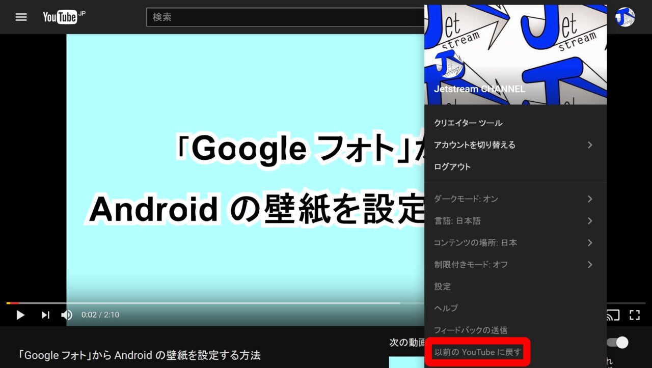 もし元のデザインに戻したい場合は、アカウントアイコンをクリックして表示されるメニューの中から “以前の YouTube に戻す” をクリックして簡単なアンケートに回答するだけで行うことができます。