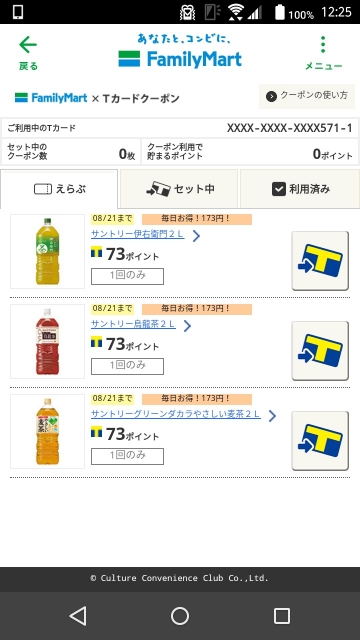 今回はサントリーのお茶(2L)3 商品が対象でその「T カードクーポン」が公開されていたので、3 商品分の「T カードクーポン」を全て「T カード」にセットして、そしてファミリーマートでお買い物をしました。