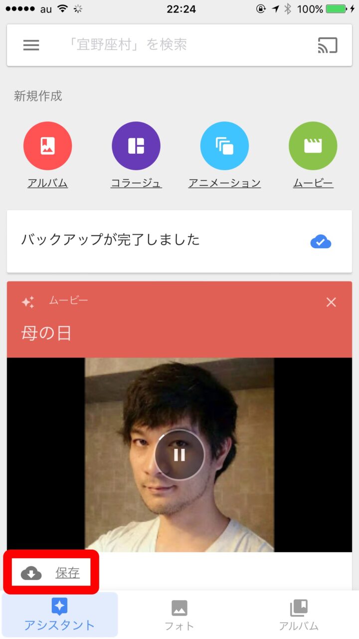 “母の日のムービー” の作成が完了すると「Google フォト」のアシスタントタブに “母の日” として表示されます。“保存” をタッチして「Google フォト」に保存することで、“母の日のムービー” をダウンロードすることも可能となります。