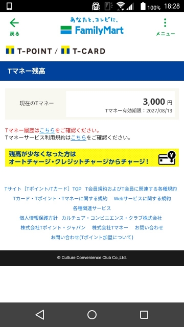 前置きが長くなってしまいましたが、こんな感じで事前に「T カード(ファミマ T カード)」に「T マネー」機能を付与し、そしてクレジットカードでチャージ(3,000 円)した状態でファミリーマートに向かいました。