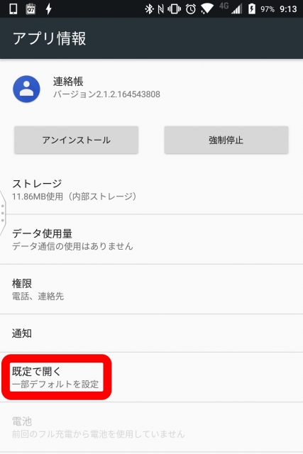 設定 → “アプリ” と進んで「連絡帳」アプリのアプリ情報を開き、“既定で開く” → “設定を消去” の順にタッチします。これで完了です。