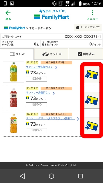 「T カードクーポン」をセットする方法は、「ファミリーマートアプリ」を開いて “クーポン” → ファミリーマートかサークル K・サンクスを選択し、購入する商品を選んで「T カード」のアイコンをタッチするだけ。