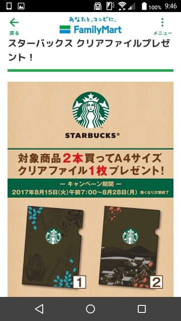 ファミリーマートではスターバックスのカップ飲料 2 本購入で、オリジナルクリアファイルをプレゼントするキャンペーンも実施中です。