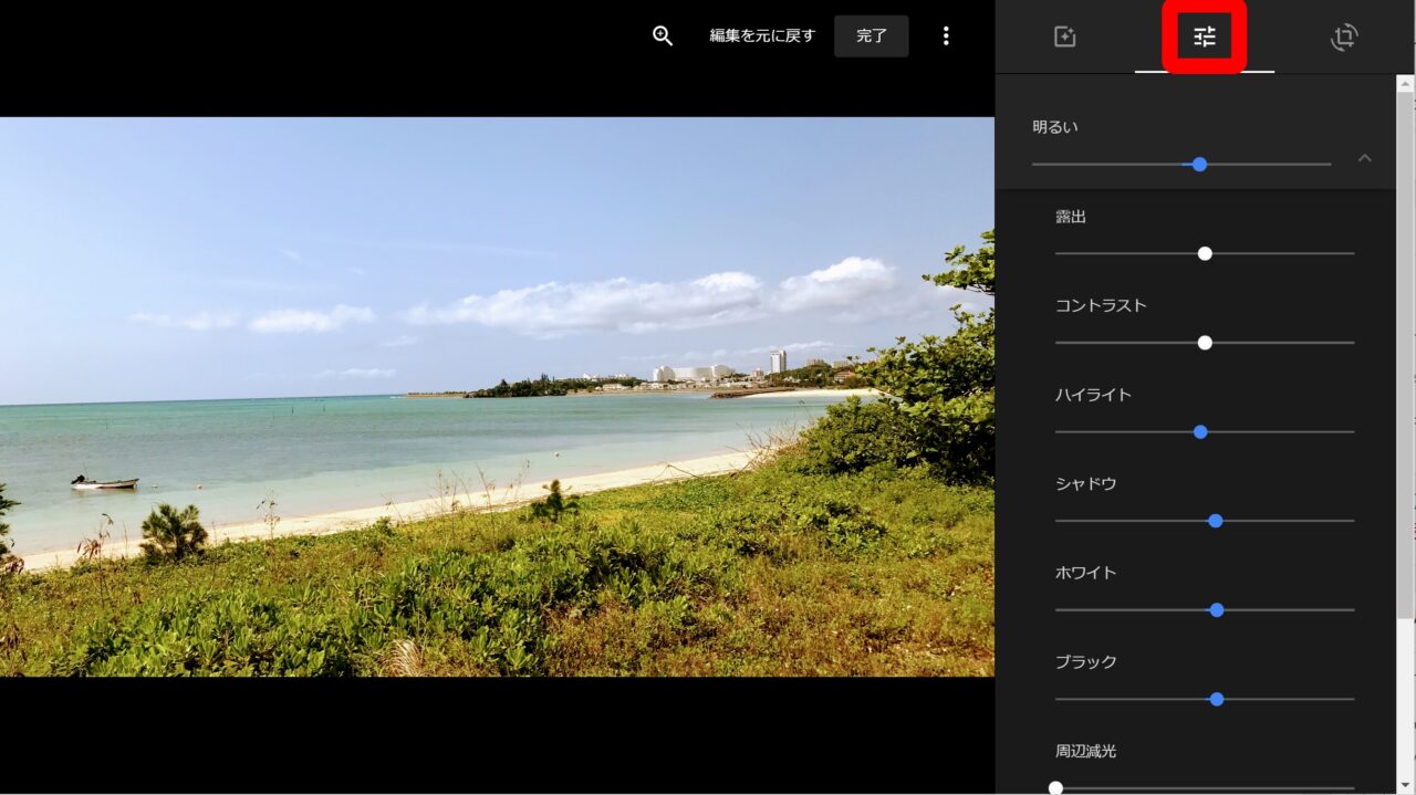 編集中は写真にマウスの矢印を置いてクリックして押したままにすることで、元の写真との比較を行うことも可能です。