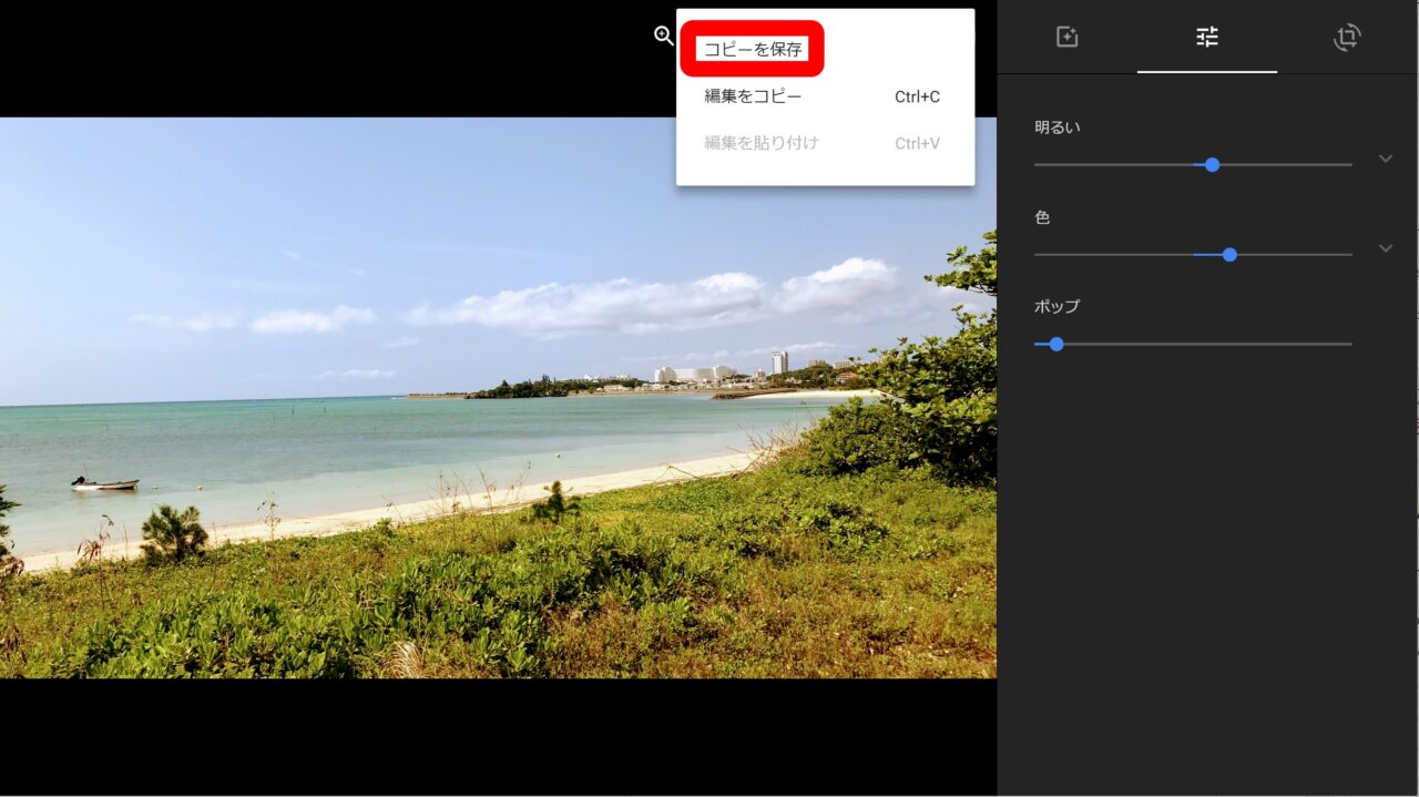 編集が完了したら “完了” をクリックすることで、“フィルタ” が反映された写真として上書き保存されますが、保存後でも “編集を元に戻す” をクリックすることでいつでも元の写真に戻すことができます。また別のファイルとして保存したい場合はメニューアイコンをクリックして “コピーを保存” をクリックします。