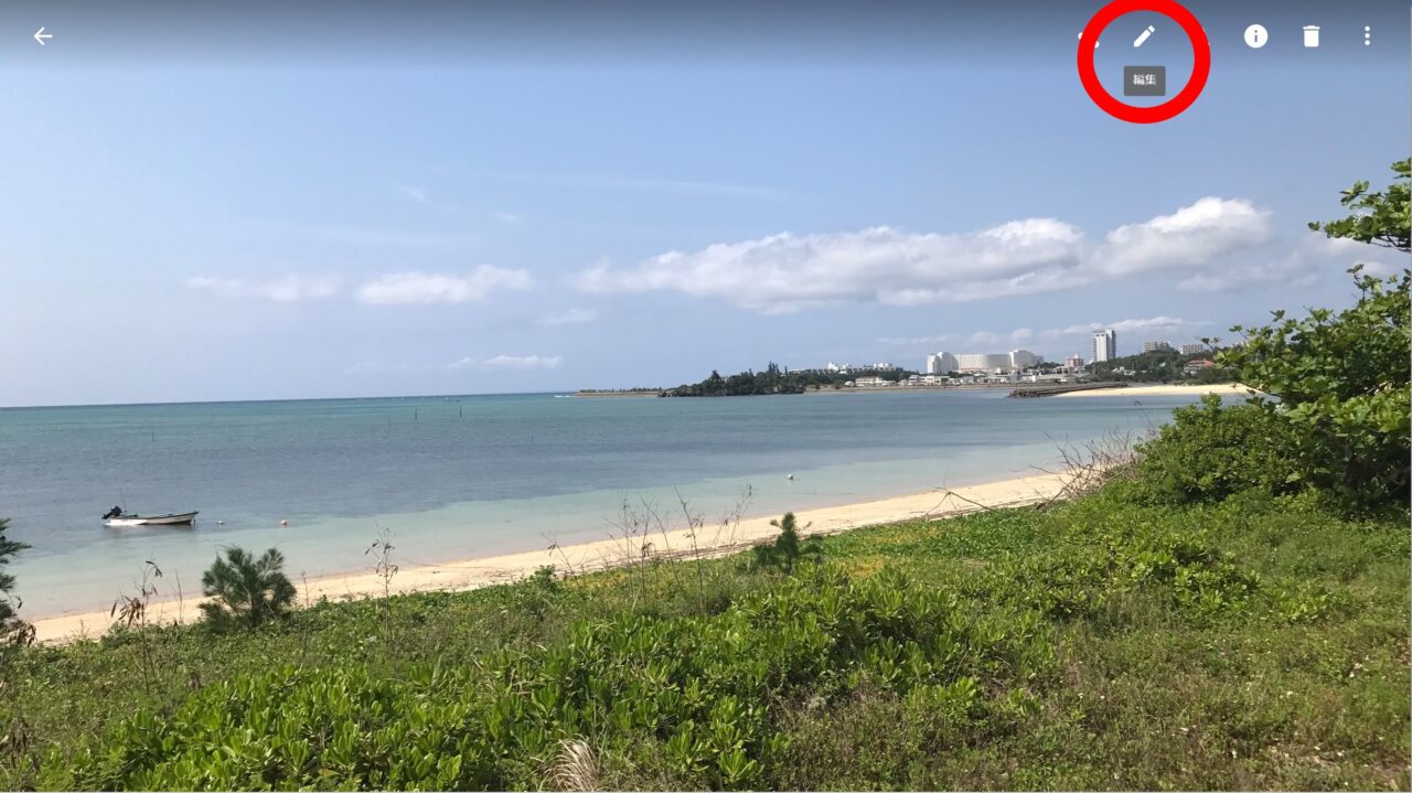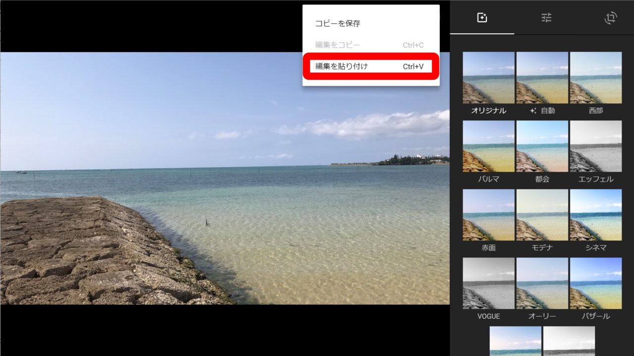次に同じ編集内容を適用する他の写真を表示して編集アイコンをクリックして編集モードにし、メニューアイコンをクリックして “編集を貼り付け” をクリックします。これで先ほど編集した写真と同じ編集内容が別の写真にも瞬時に適用されます。