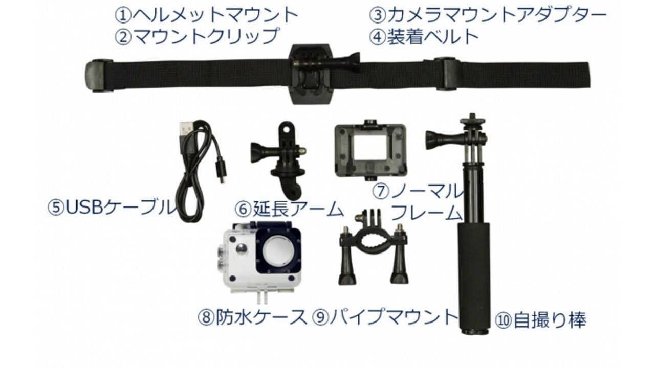 ただし、カメラスペックは同じものの、型番「TAC-15S」には「TAC-15」に付属されていない自撮り棒(⑩)が付属しているそうです。確かに私が購入した型番「TAC-15」には自撮り棒が入っていませんでした。