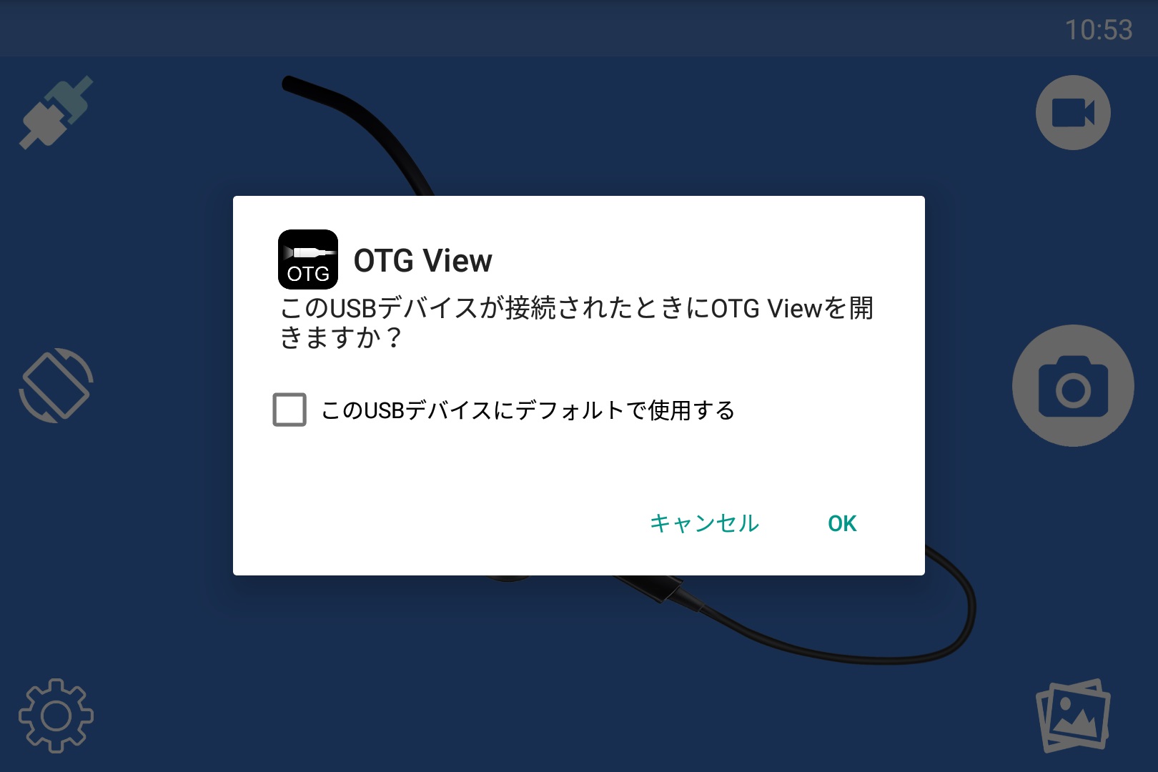 「KEYone」側で先ほどインストールしたアプリを起動すると、USB OTG で接続している機器をデフォルトで使えるようにするかどうかのアラートウィンドウが表示されます。チェックを入れて OK をタッチすることで、以降はこのウィンドウは表示されず、「アクティブギア フル HD カメラ」を接続した時点でアプリがダイレクトに起動するようになるので便利です。