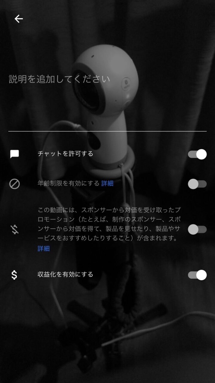 次に “ライブ配信” のタイトルを設定します。タイトルを設定しないと “ライブ配信” を行うことはできません。このほかこの画面では公開範囲の設定や収益設定などを行うことも可能です。