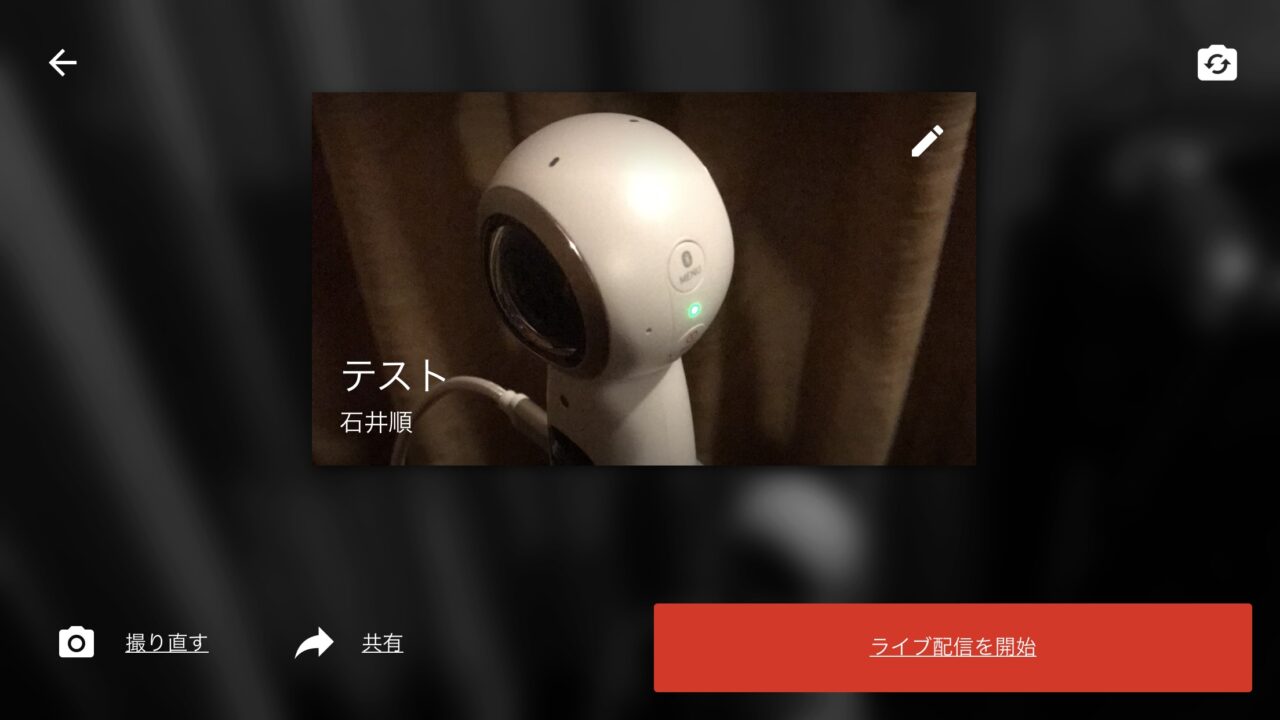 この画面では共有アイコンをタッチすることで SNS などに “ライブ配信” のお知らせを投稿することもできます。そしてサムネイルを設定して “ライブ配信を開始” をタッチすることで “ライブ配信” が開始されます。