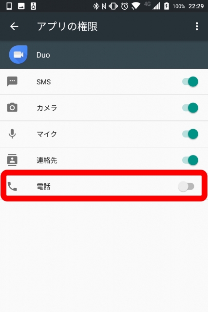 Android 版「Google Duo」通話履歴の管理は、アプリの権限設定で “電話” のスイッチを OFF にすれば行われなくなる仕様でした。