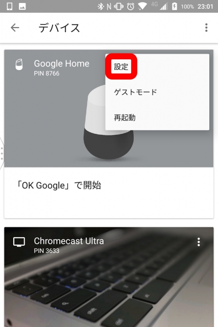 「Google Home」の “ペア設定モード” を ON にする方法は、「Google Home」アプリを開いて右上のデバイスアイコンをタッチし、「Google Home」の メニューアイコンをタッチして “設定” をタッチします。