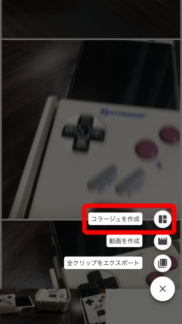 コラージュ機能は、複数の “クリップ” を “+” からストックした際に利用できる機能で、画面を分割して各分割部分に “クリップ” を当てはめ、分割状態で “クリップ” の同時再生動画を作成することができる機能です。