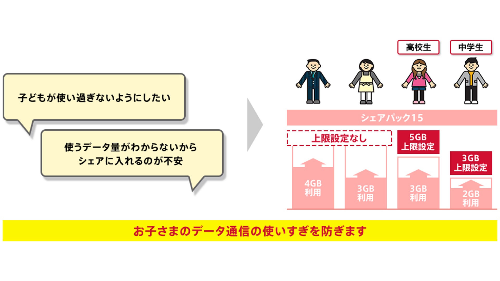 「シェアパック」はこれまで、子回線に対して個別にデータ通信容量上限を設定することができなかったため、例えばお子さんが主回線の上限までデータ通信容量を使ってしまった場合、主回線とほかの子回線において通信制限が掛かってしまう仕様となっていました。