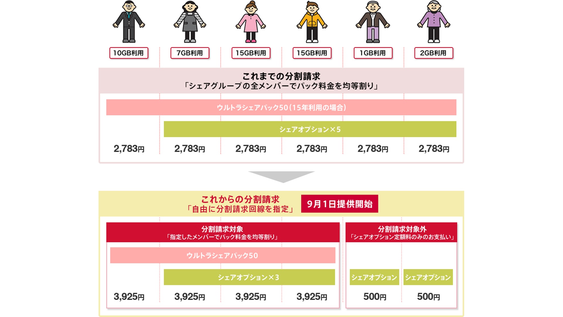 また今回の個別のデータ通信上限設定機能提供に伴い、「シェアパック」の基本料支払いを分割する対象メンバーも指定できるようになります。