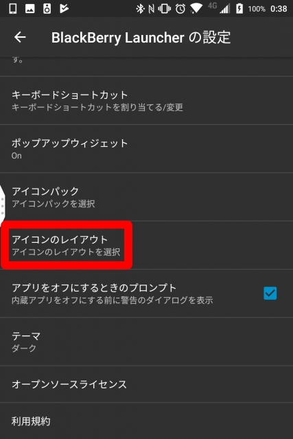 この “アイコンのレイアウト” は、「BlackBerry ランチャー」アプリの設定項目に新たに追加されています。