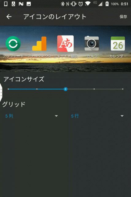 実際に設定できる項目は、“アイコンサイズ” と “グリッド” の “列” と “行” です。まずは “アイコンサイズ” は 5 段階、“グリッド” の “列” は 4 ~ 9 列、“グリッド” の “行” は 3 ~ 7 行の間で設定することができます。ただし“グリッド” の “列” と “行” は “アイコンサイズ” によっては選択できる枠が縮小調整されます。
