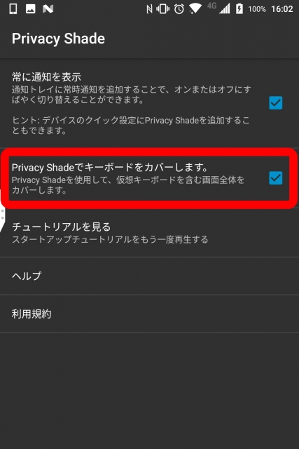 「Privacy Shade」アプリv1.2.0.45 アップデートではこのほかに、ディスプレイキーボード(仮想キーボード)部分まで隠すことができる設定も追加されました。