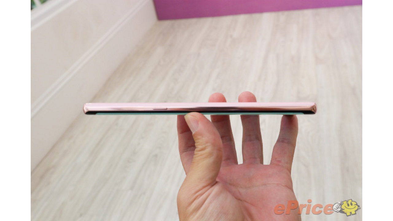 一見リアカバーを被せているようにも見えますが、これが「Galaxy Note8」“ピンク” そのものです。ソフトピンクといった感じでしょうか。ただフレーム部分は光沢のある仕様で、リアカバーとは異なる仕上がりとなっています。より女性が好みそうな色合いですね。