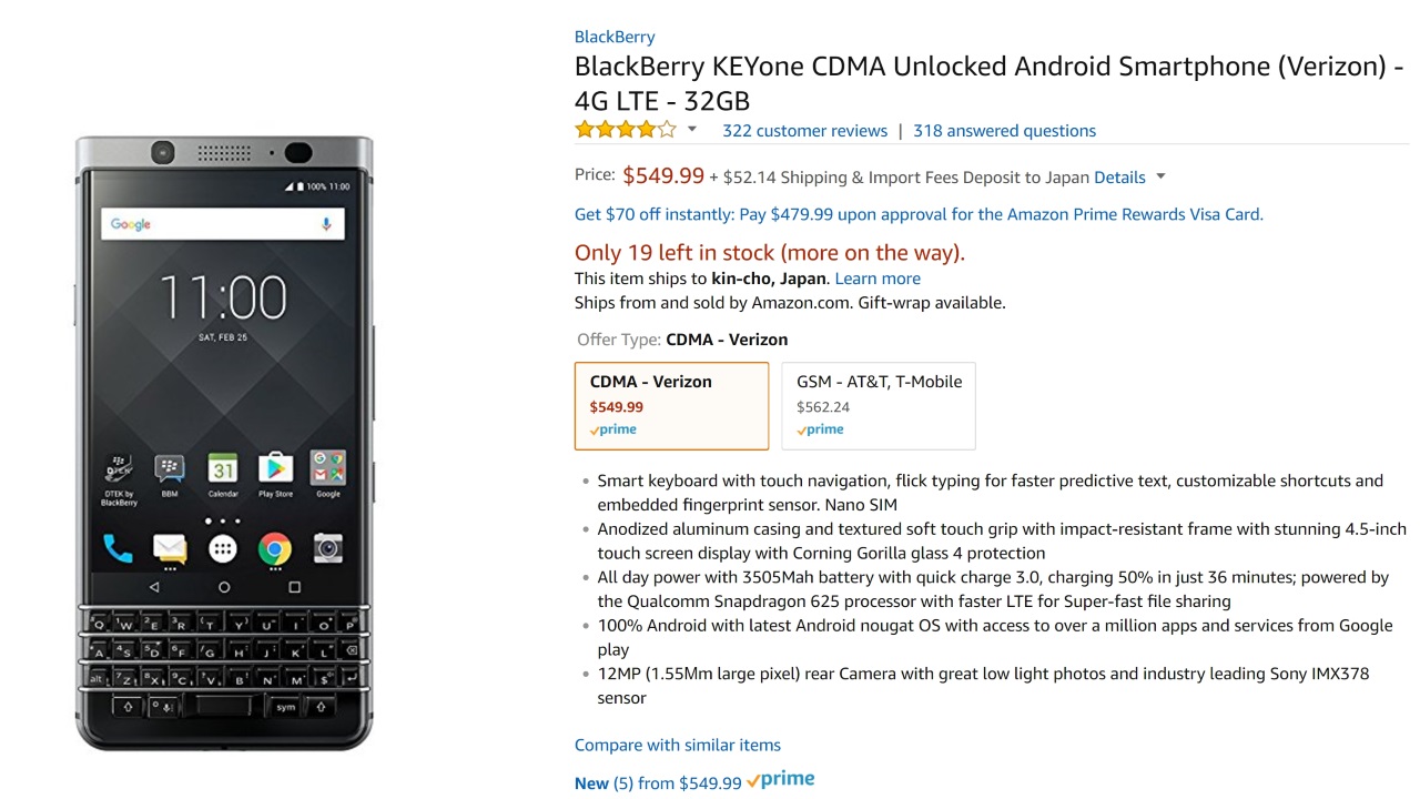 先週久しぶりに公式予約が再開された、「BlackBerry KEYone」の米国向け CDMA モデル型番「BBB100-3」、9 月 1 日の入荷予定よりも早く米国の Amazon.com に入荷しました。