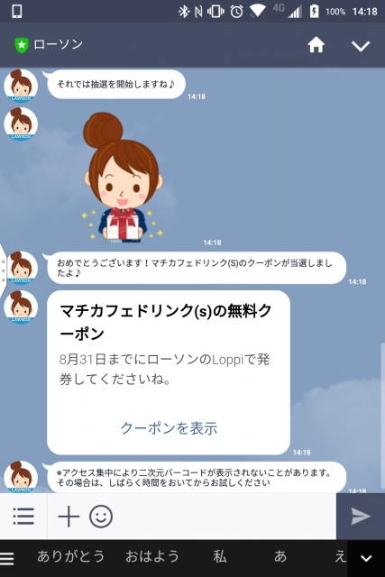 マチカフェドリンク1 杯無料券の入手方法は、ローソンの LINE アカウントを友だちに追加し、チャットの中で “マチカフェ大好き” と話しかけるだけです。抽選で 70 万名に、マチカフェドリンク 1 杯無料券がプレゼントされます。