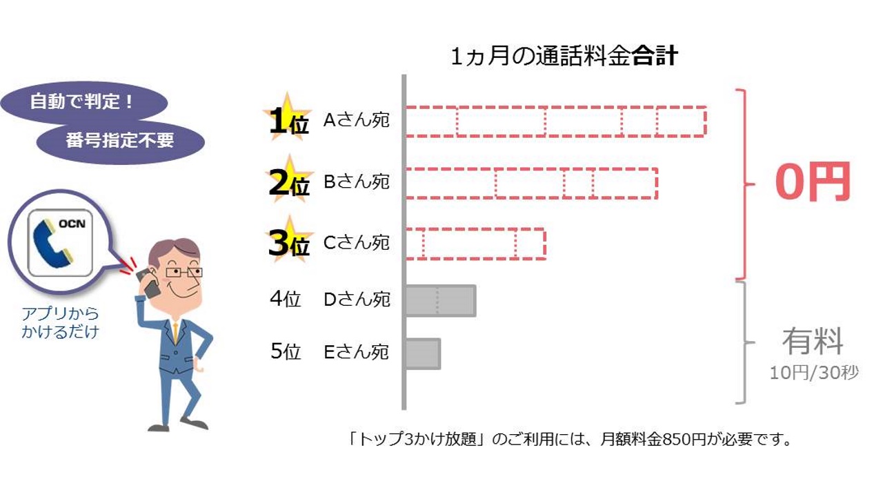「トップ 3 かけ放題」は、毎月の電話履歴の中から上位 3 番号の通話料金が自動で無料となるサービスです。
