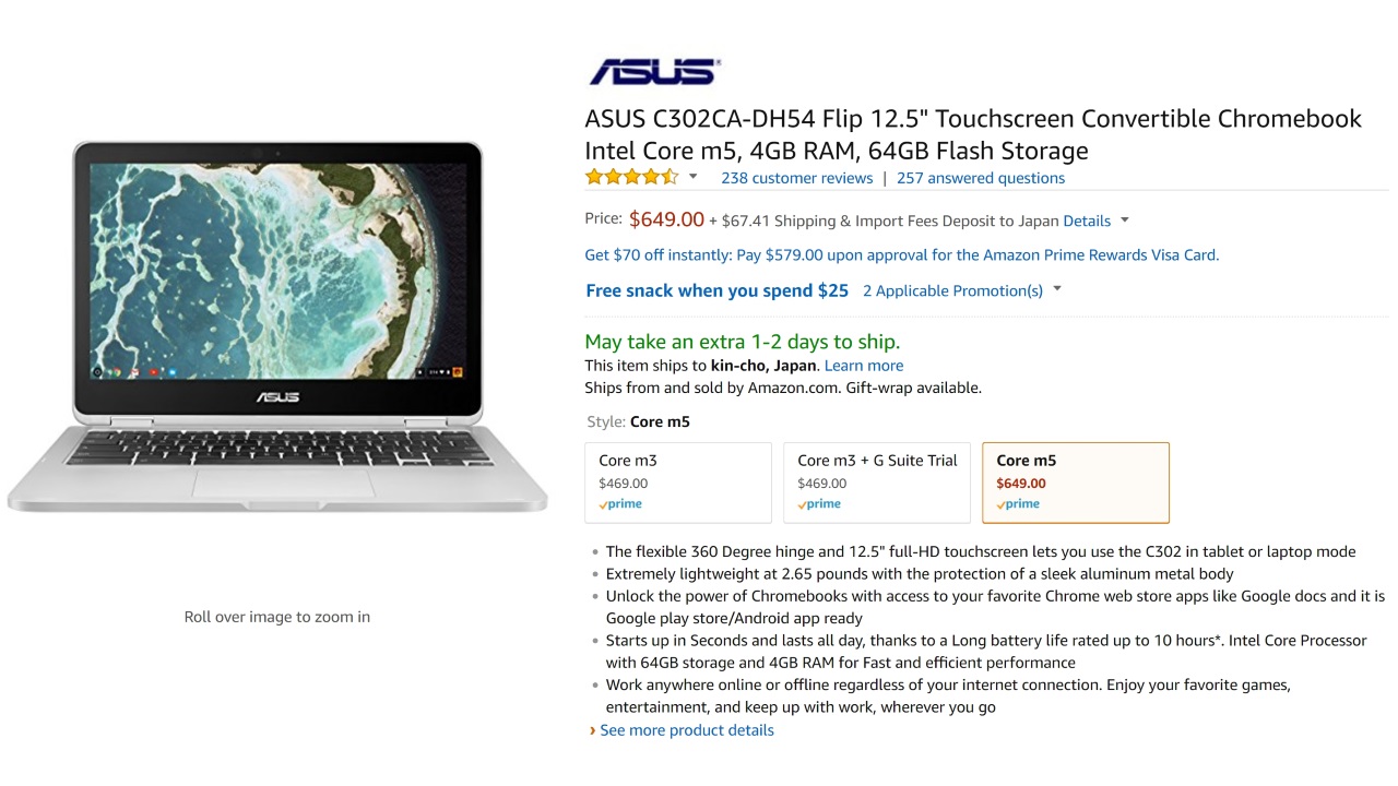 Amazon における「Chromebook Flip C302CA-DH54」は、本体価格 $649 で日本直送に対応しています。輸入総額は以下の通りです。