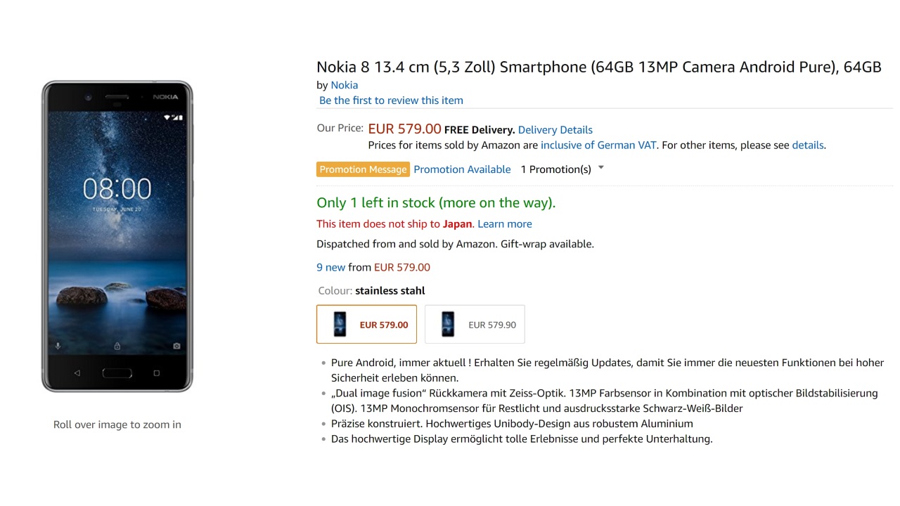 ドイツAmazonから「Nokia 8」直輸入可能に