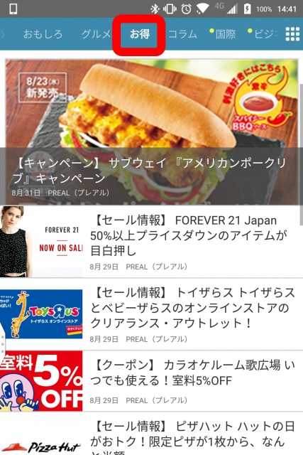 “お得” タブは、ニュースのカテゴリタブの中に格納されています。