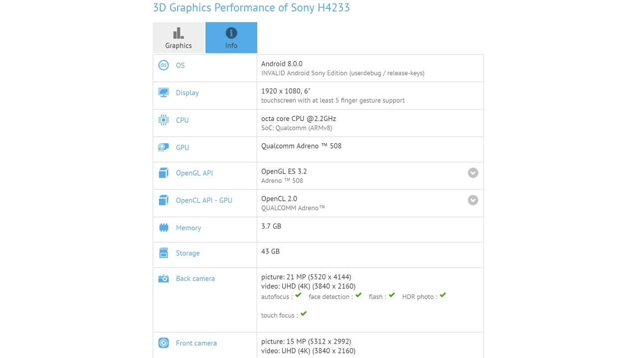 Sony Mobile の未発表型番となる型番「H4233」が、ベンチマークサイト GFX Bench に登場しました。ベンチマーク情報より、ある程度の主要スペックが判明しています。