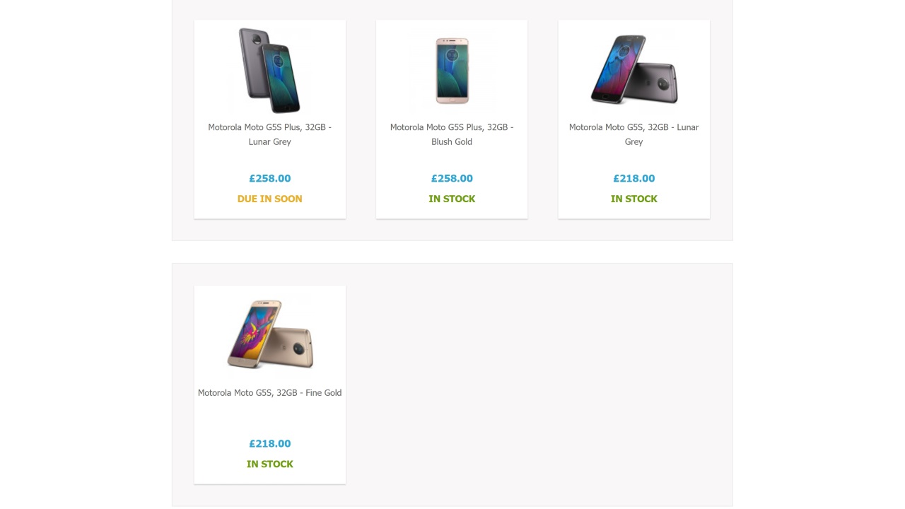 現在「Moto G5S」の “Lunar Grey” と “Fine Gold” の 2 色、「Moto G5S Plus」の “Blush Gold” が在庫ありで販売されています。