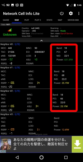 今回の情報も、当ブログの読者様(PH-1 様)によるレポートです。KDDI 製のガラホに挿さっていた SIM を「Essential Phone」に挿し、「Network Cell Info Lite」アプリで確認してみたら以下のようになったとのこと。