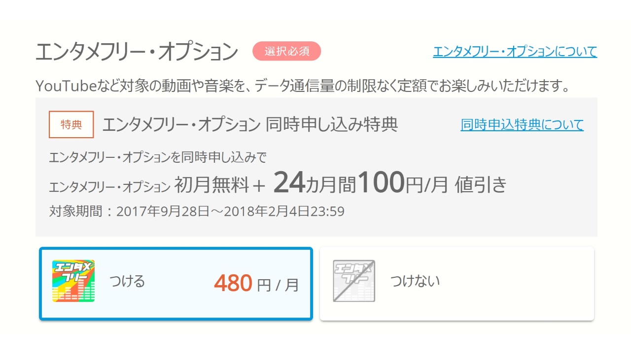 「エンタメフリー・オプション」は、「BIGLOBE モバイル」の 3GB 以上(3 ギガプラン)のデータ通信容量プランに付属できる、有料のオプションサービスです。