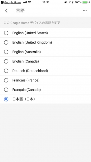 iOS 版「Google Home」アプリでは、「Google Home」の設定項目に言語変更項目が用意されているのでファームウェアアップデート後に “日本語” が表示されるようになり、“日本語” を選択することで日本語での操作を行うことができるようになります。