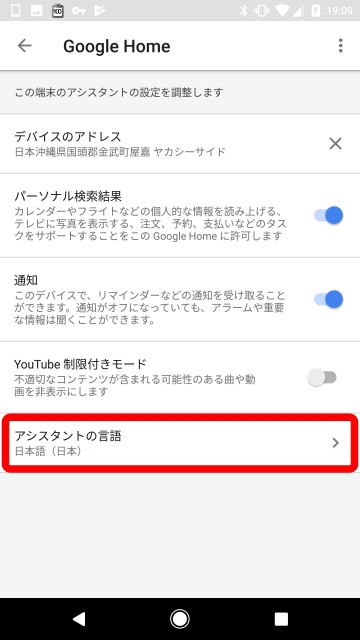「Google Home」の日本語サポートは、今のところファームウェアのアップデートに加えて、スマートフォン用「Google Home」アプリ側で言語の変更を行う必要がある模様です。「Google Home」アプリの「Google Home」の言語の変更は、Android 版アプリの場合はファームウェアアップデート後に「Google」アプリの「Google アシスタント」設定から「Google Home」の設定を開くことで行うことができます。
