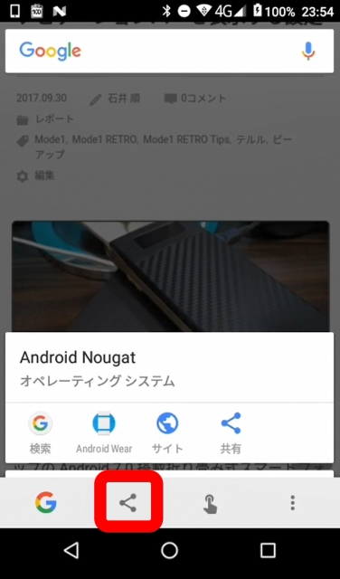ナビゲーションボタンが表示される状態にしたら、スクリーンショットを撮影する画面でディスプレイ上のホームボタンを長押しして「Now on Tap」を起動し、共有ボタンをタッチします。するとスクリーンショットが撮影されます。