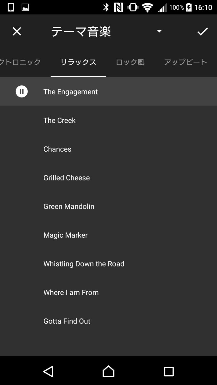次に音楽です。音楽はスマートフォンにダウンロードしてある音楽ファイルのほかに、「Google フォト」で用意されている “テーマ音楽” から選択することもできます。