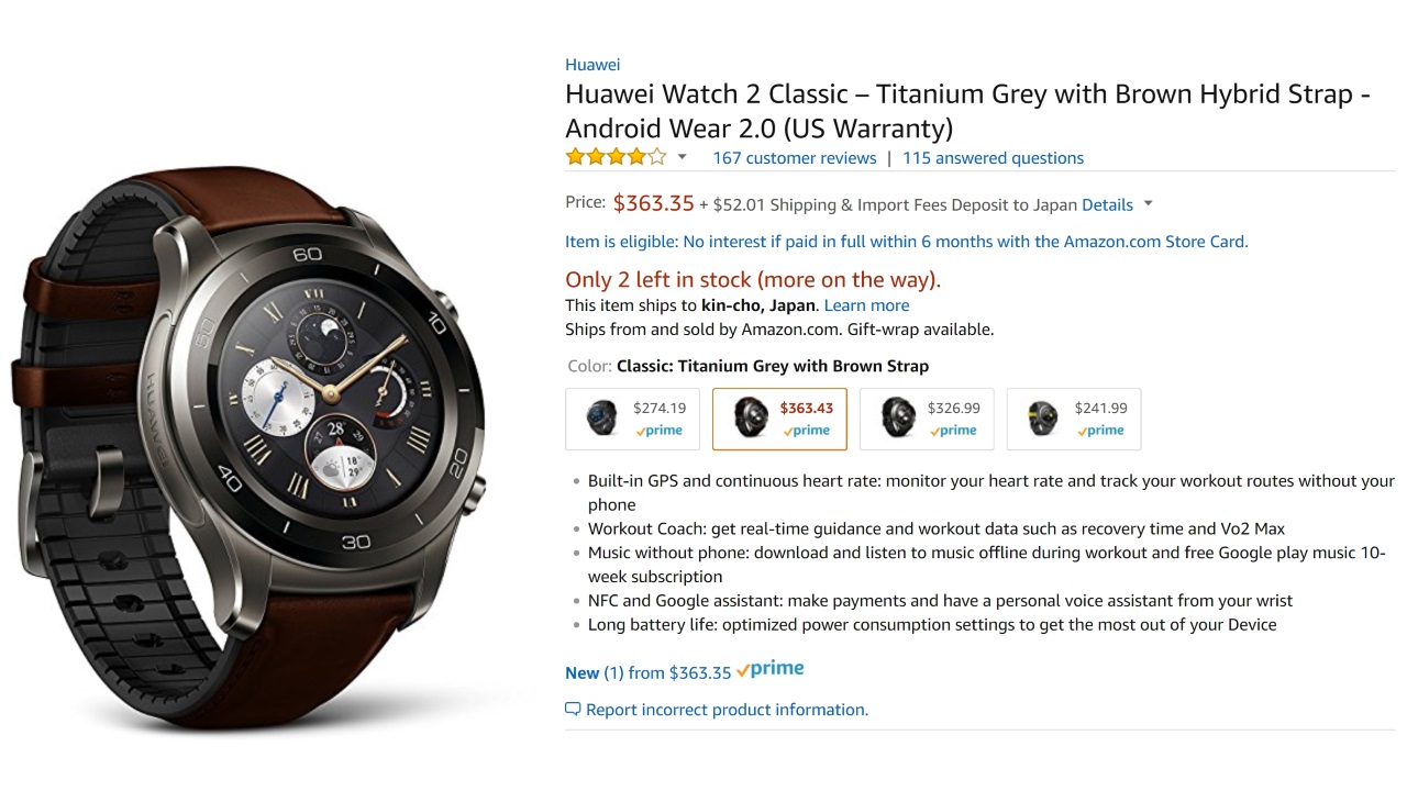 先日ご紹介させていただいた、米国の Amazon.com に新たにラインアップされた「Huawei Watch 2 Classic」ブラウンストラップが、当初 1 ~ 2 カ月以内の入荷予定だったにもかかわらず、早くも入荷した模様です。