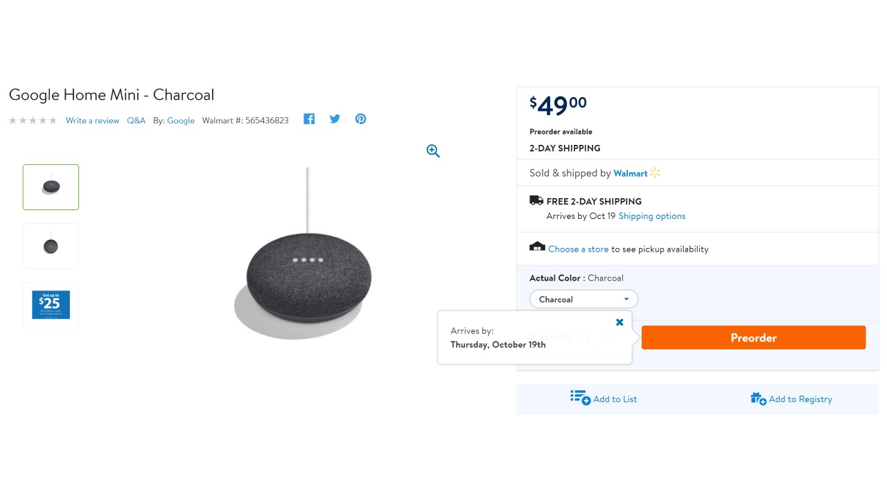 米国の大手スーパーマーケット Walmart が、明日 Google から正式発表される予定の新型スマートスピーカー「Google Home Mini」の予約を開始しました。