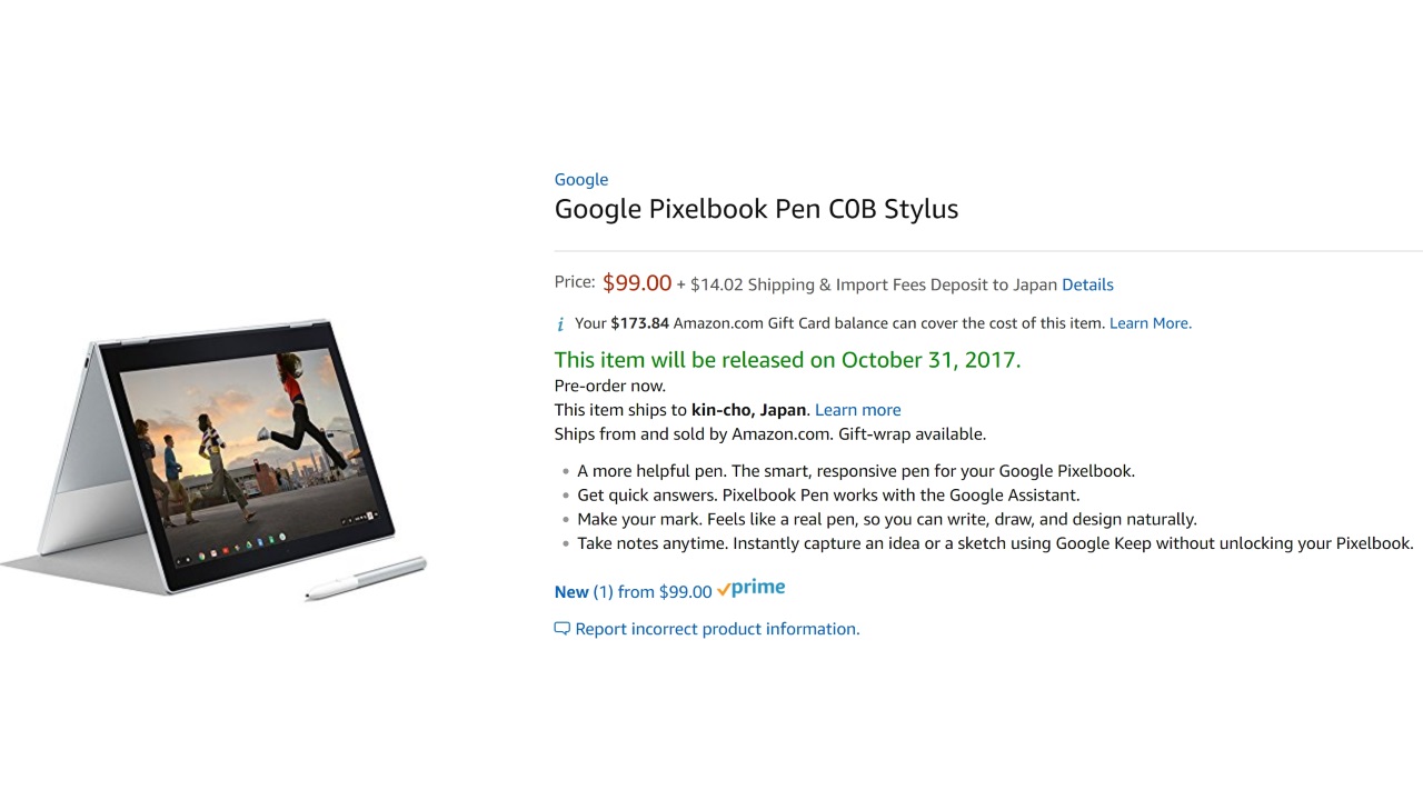 Amazon における「PixelBook Pen」の本体価格は公式価格と同じく、$99 です。そして「PixelBook」本体と同じく、日本直送にも対応しています。「PixelBook」本体しか予約を行っていない方は、是非ご一緒にどうぞ。
