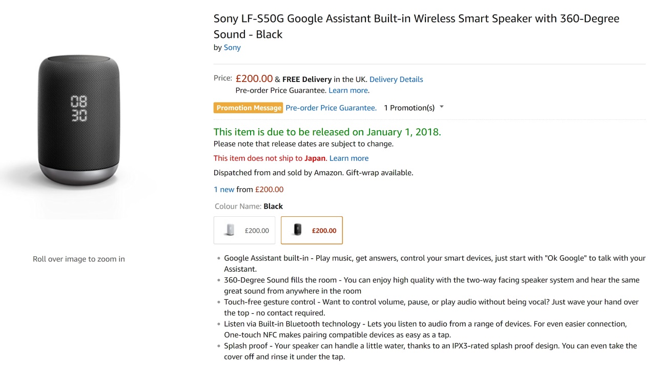 Sony が IFA 2017 で発表した「Googla アシスタント」内蔵スマートスピーカー「LF-S50G」の予約が、英 Amazon.co.uk で開始されました。
