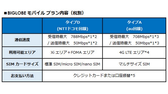 BIGLOBE は 2017 年 10 月 10 日、同社の MVNO サービス「BIGLOBE モバイル」において、これまでの NTT ドコモ回線を利用したプランの他の、KDDI 回線を利用した「タイプ A」の提供を開始しました。